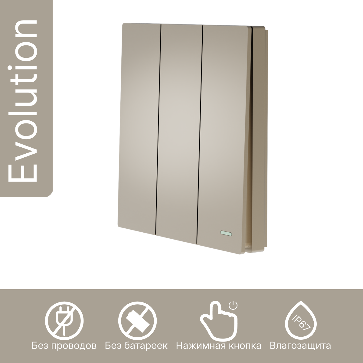 Умный беспроводной выключатель GRITT Evolution 3кл. золотистый комплект: 1 выкл. IP67, 3 реле 1000Вт 433 + WiFi с управлением со смартфона, EV221330GWF информация: