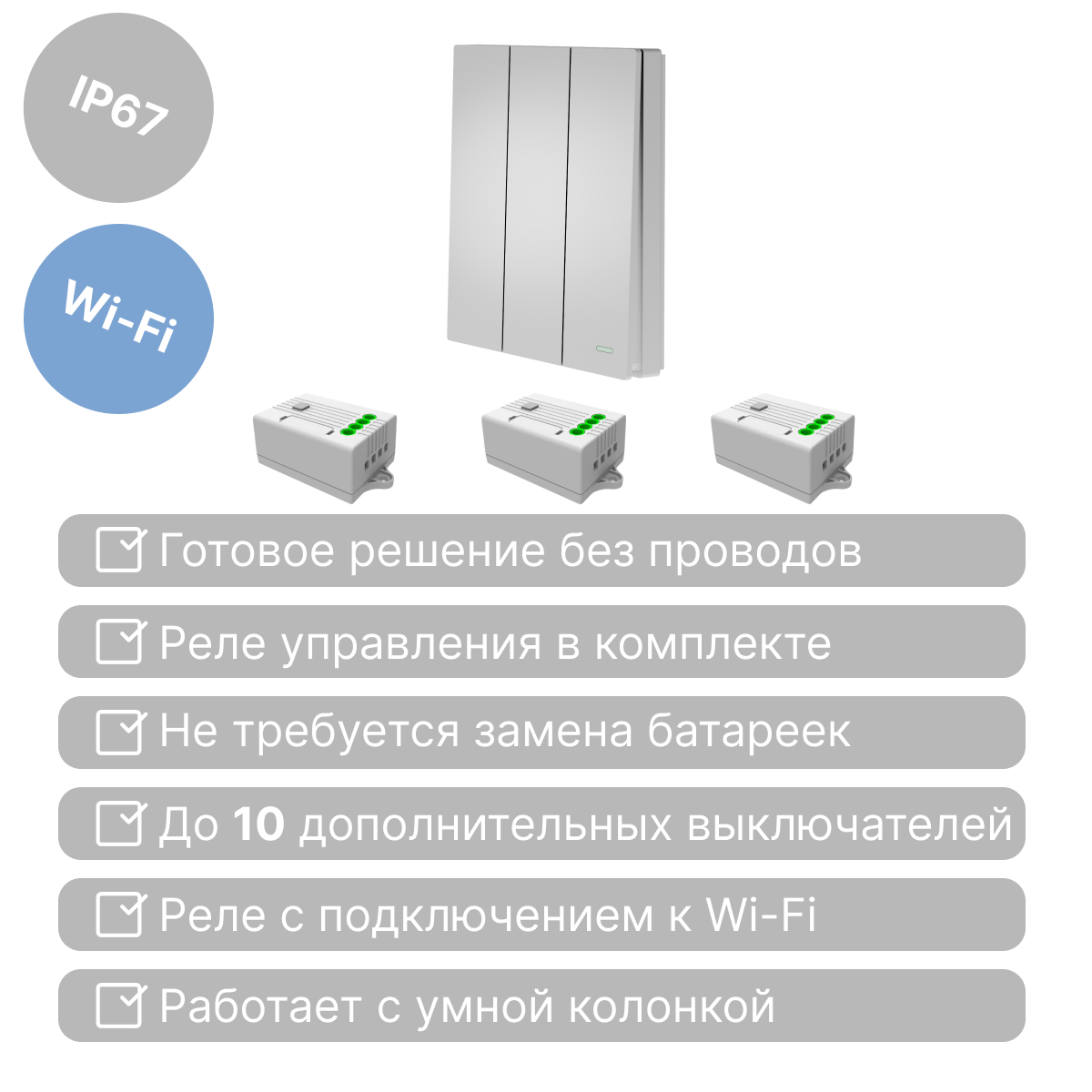 Умный беспроводной выключатель GRITT Evolution 3кл. белый комплект: 1 выкл. IP67, 3 реле 1000Вт 433 + WiFi с управлением со смартфона