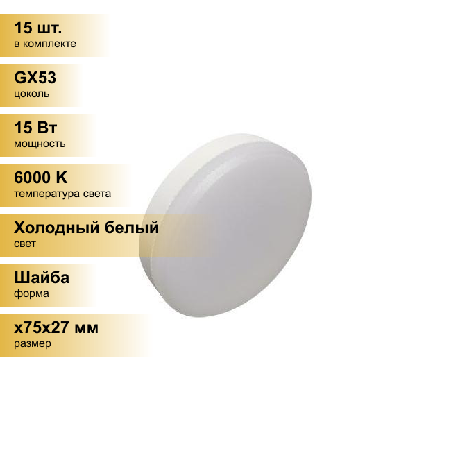 10 цен на (15 шт.) Светодиодная лампочка Ecola GX53 св/д 15W 6000K 6K 27x75 матов. Premium T5UD15ELC Холодный белый. Цоколь GX53
