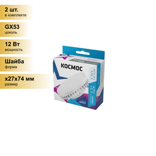 (2 шт.) Светодиодная лампочка Космос GX53 св/д 12W(1150lm) 4500K 4K 28x75 матов. Lksm_LED12wGX5345C . Цоколь GX53 информация:
