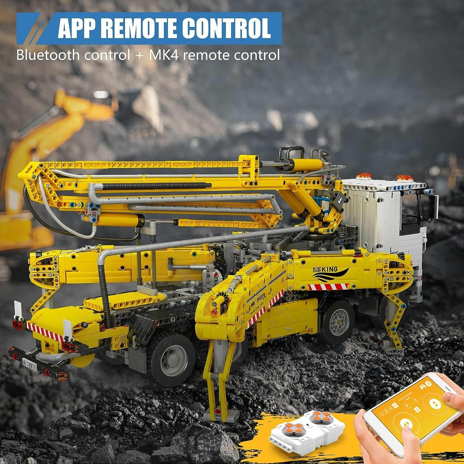 Конструктор Mould King 19003 Пневматический кран, строительная машина, бетоновоз, 4368 дет., с ДУ, желтый
