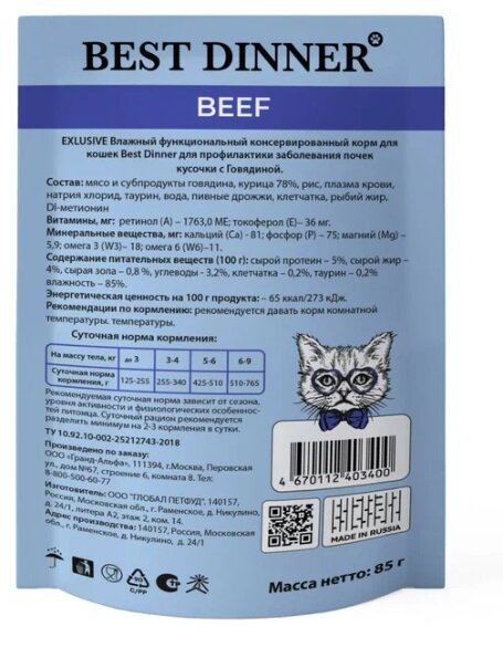 BEST DINNER EXCLUSIVE VET PROFI RENAL д взр кош при заболевании поч с говяд в соусе пауч 85 гр NEW 85 гр х 12 шт