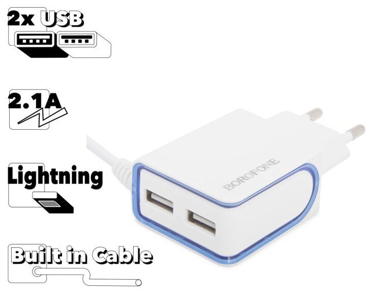 Отзывы на Блок питания (сетевой адаптер) BOROFONE BA35 Brilliant 2xUSB, 2.1А с интегрированныым кабелем Lightning 8-pin, 1м (белый)