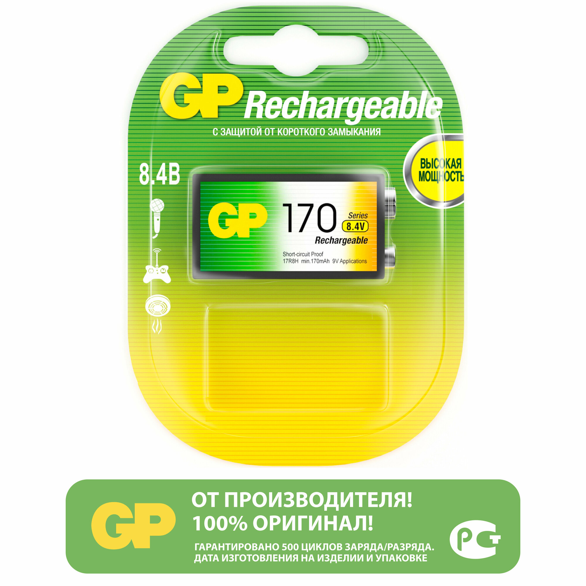 Перезаряжаемые аккумуляторы GP 17R8H 9V Крона, ескость 170 мАч - 1 шт. в блистере