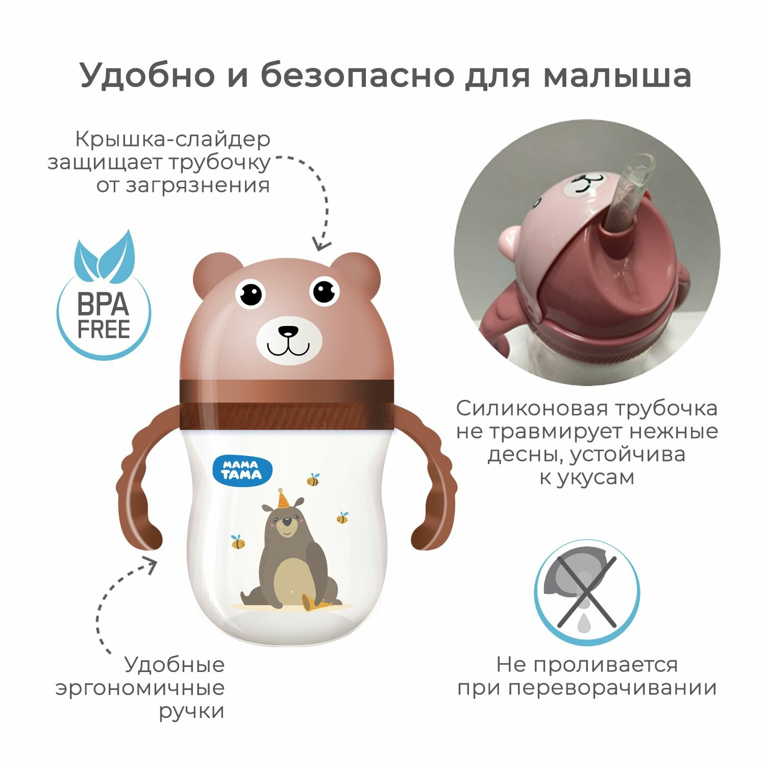 Поильник-непроливайка мама тама с силиконовой трубочкой 12мес.+, 240 мл, цвет: коричнево-бежевый 509 ₽