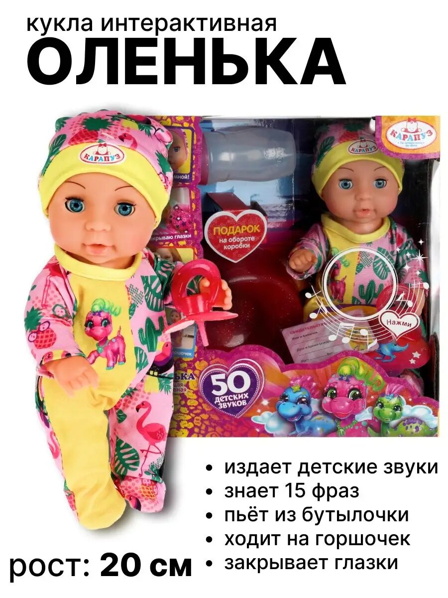 10 цен на Пупс Карапуз "Оленька", озвученный, 20 см, пьет, писает, закрывает глаза, 50 звуков, 3 аксессуара (Y20BR-DP-DINO-22-RU)