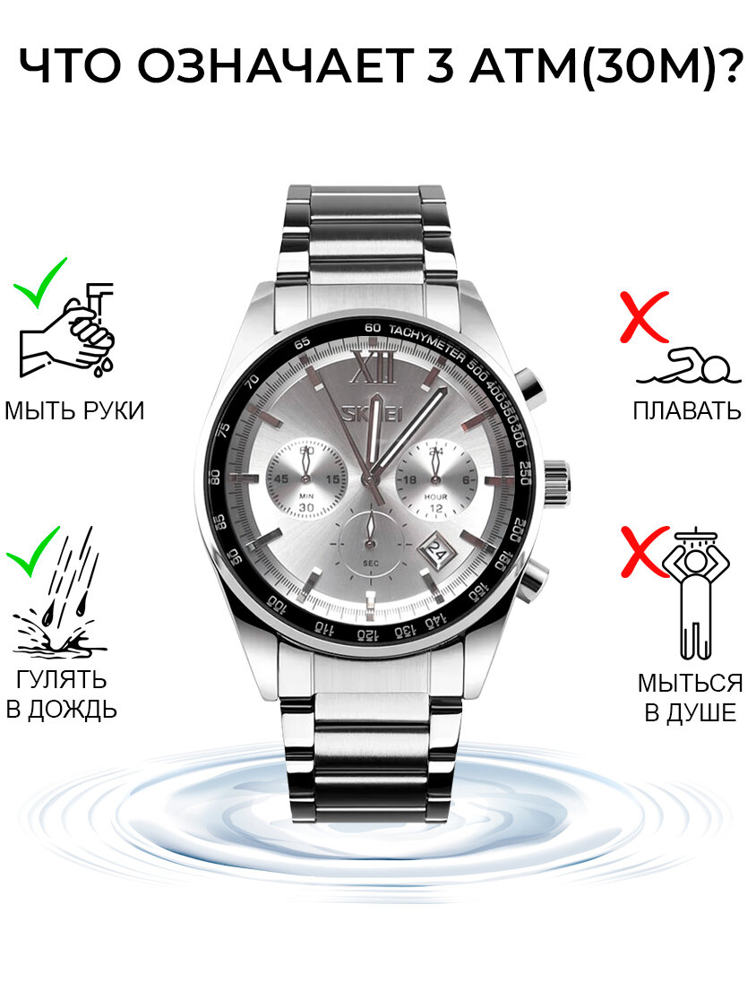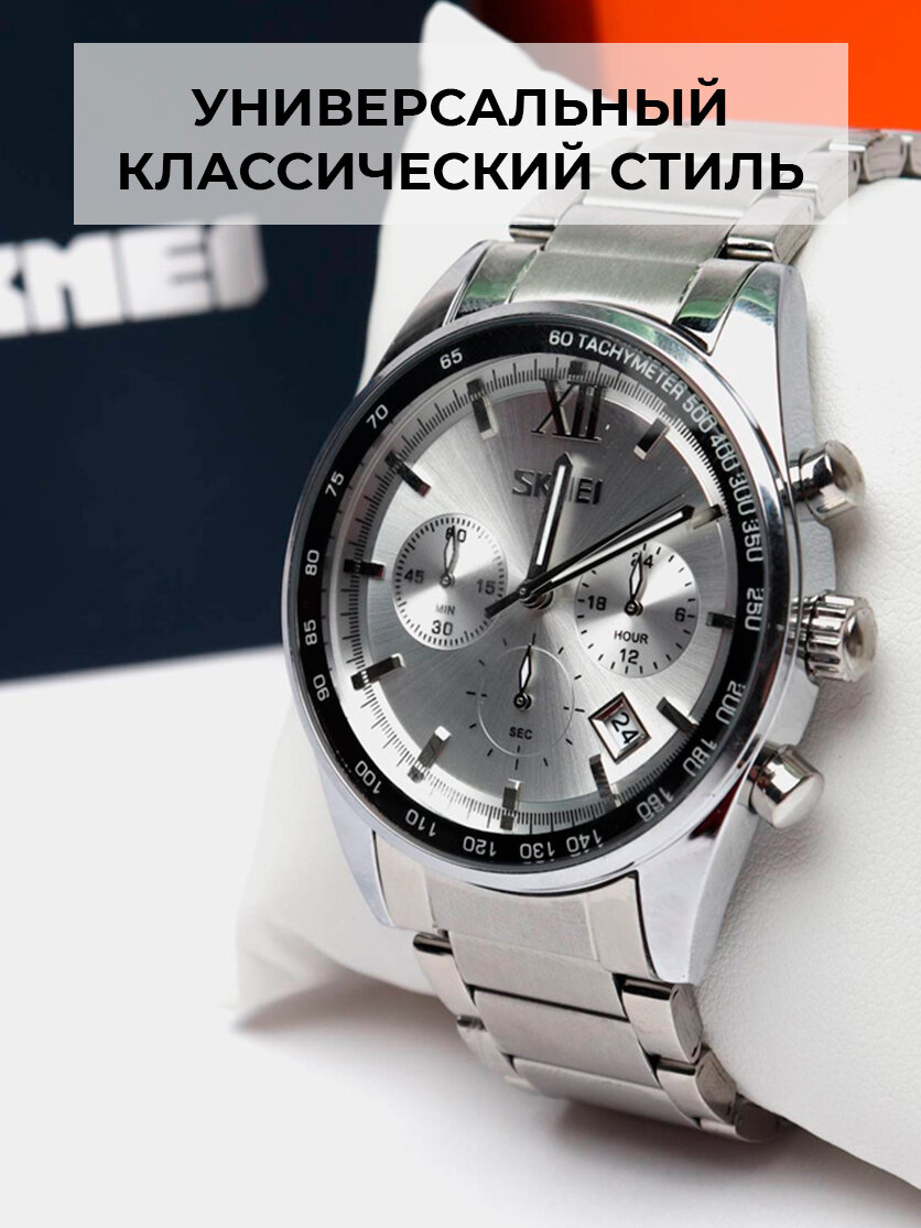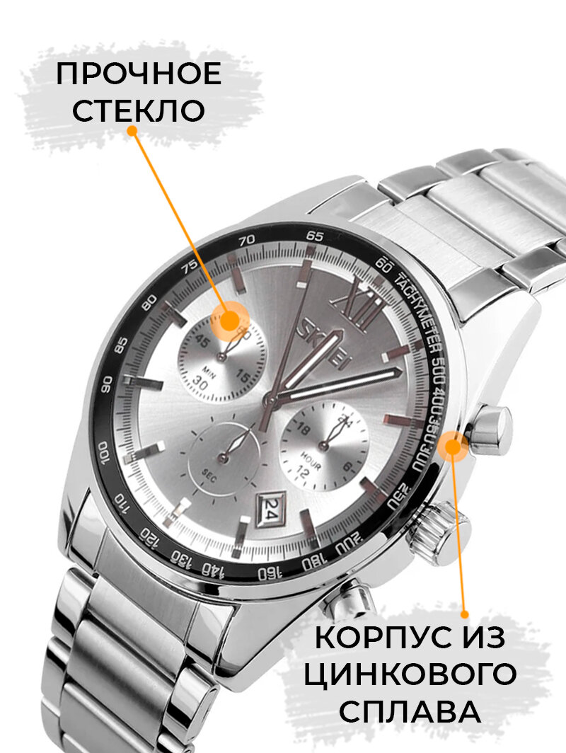 Часы наручные мужские классические SKMEI с секундомером, серебристые информация: