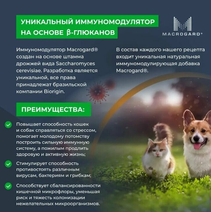 | Состав | дегидрированное мясо индейки (33%), цельнозерновой рис, протеин растительного происхождения, ячмень, жир куриный, пульпа сахарной свеклы, гидролизованная и дегидратированная куриная печень, витаминно-минеральный премикс, дрожжи (источник MOS), семена льна, дегидрированное яйцо, аминокислота DL-метионин, антиоксиданты, таурин, глюкозамина гидрохлорид, хондроитина сульфат, пребиотик MacroGard (источник β-глюканов), экстракт розмарина (природный антиоксидант и натуральный консервант), экстракт фенхеля (источник витаминов, микро- и макроэлементов), экстракт морских водорослей (фукус), экстракт юкки Шидигера |