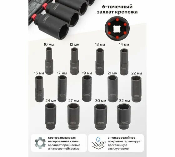 FORSAGE F-4137MPB набор головок 1 / 2, ударные, глубокие, 13пр., (10, 12-15, 17, 19, 21, 22, 24, 27, 30, 32мм)