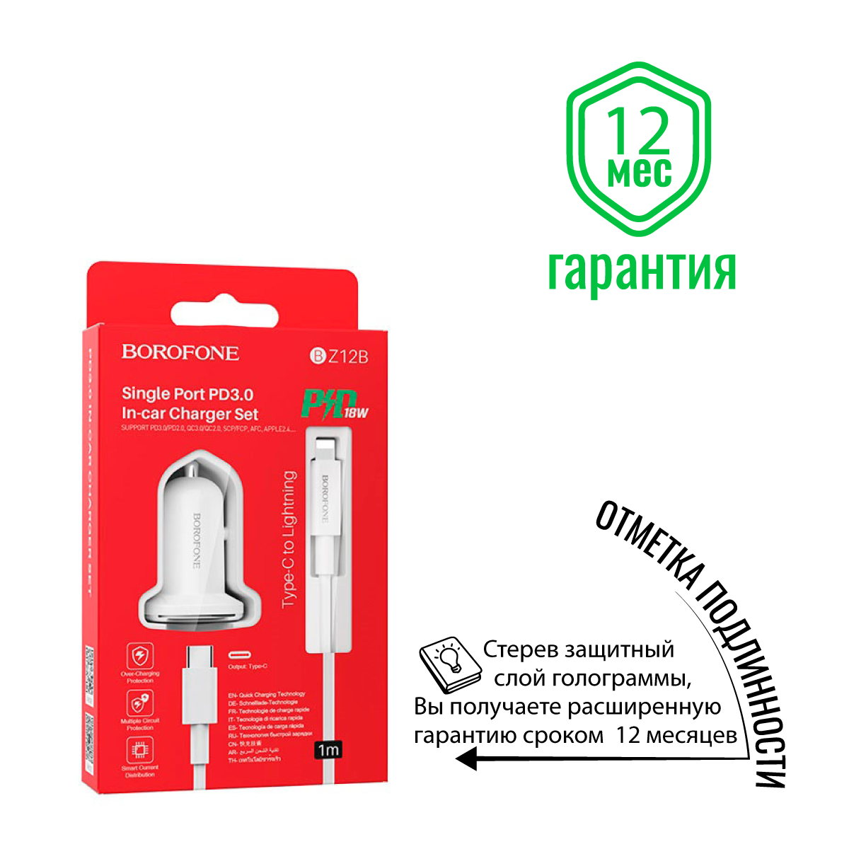 Быстрая зарядка автомобильная для телефона, смартфона в прикуриватель, на 1 usb(юсб) Type-c, тип с порт, с проводом на айфон Lightning / BOROFONE BZ12B информация: