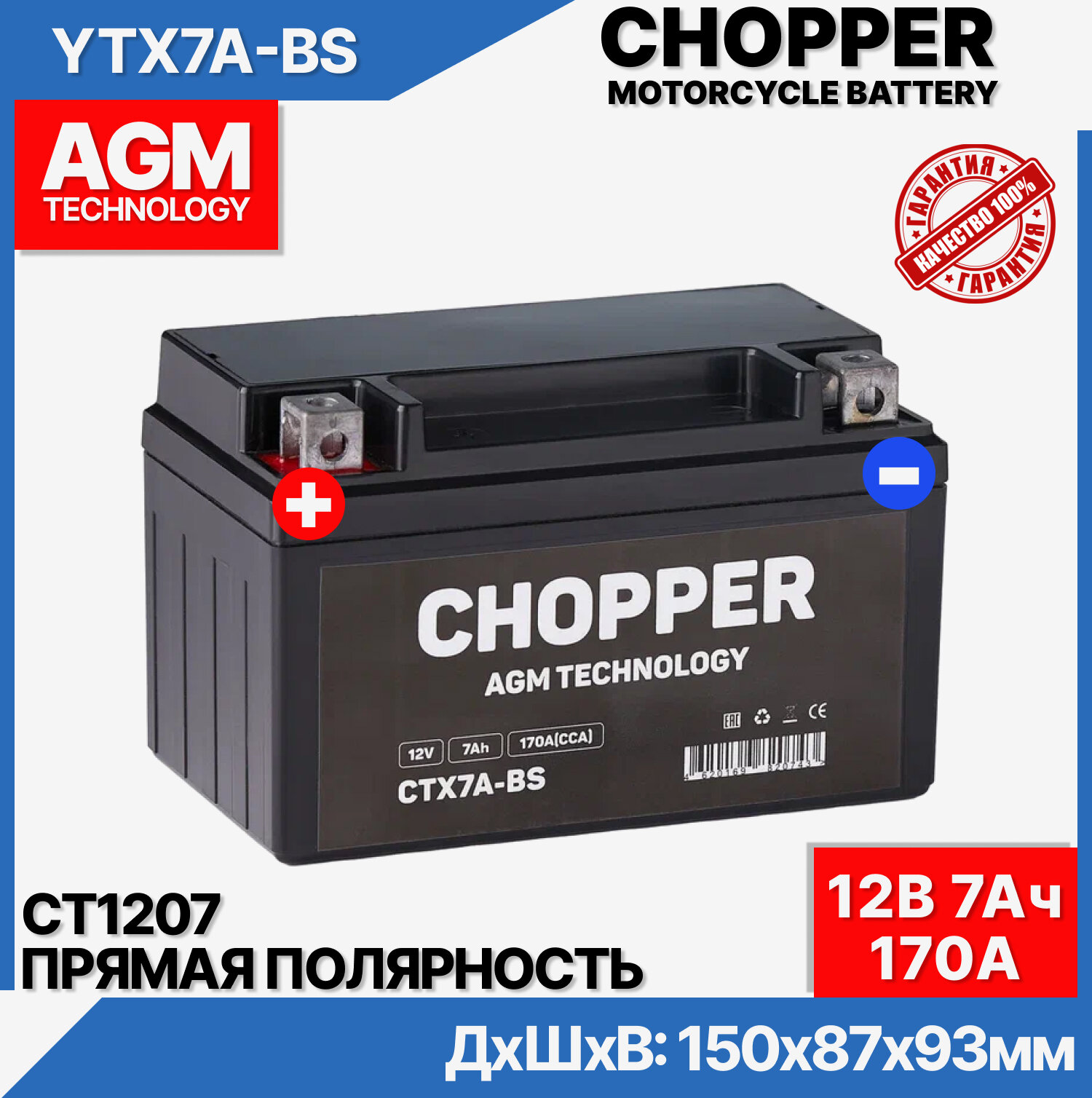 Мото Аккумулятор CHOPPER AGM 12В 7 Ач (СТ1207, YTX7A-BS) для мотоцикла, мопеда, скутера 12V 7Ah информация: