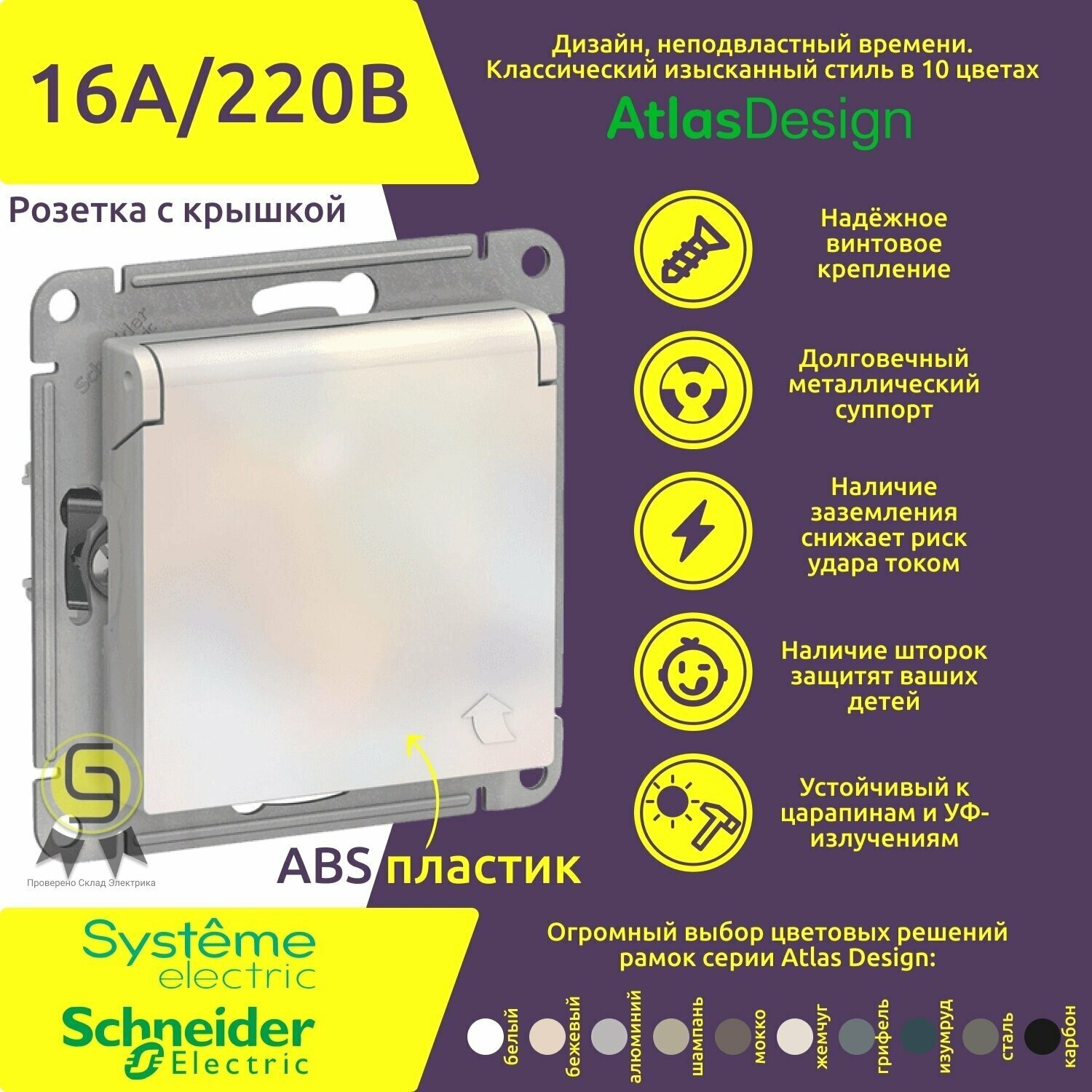 10 цен на Механизм розетки Schneider Electric AtlasDesign с заземлением, с защитными шторками, с крышкой, цвет Жемчуг (комплект 5шт)