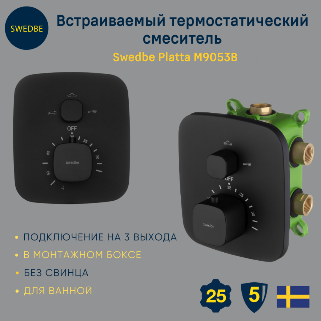 Встраиваемый термостатический смеситель подключение на 3 выхода в монтажном боксе Swedbe Platta информация: