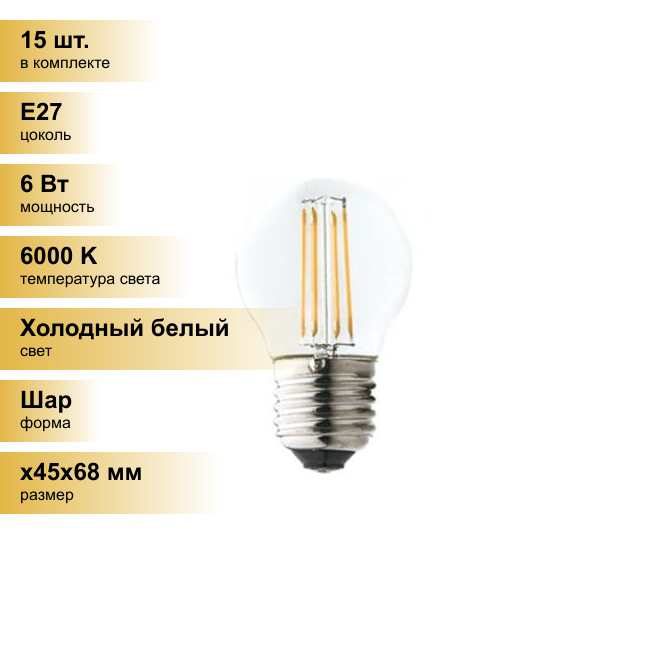 10 цен на (15 шт.) Светодиодная лампочка Ecola шар G45 E27 6W 6000K 6K прозр. 68x45 филамент (нитевидная), 360° Premium N7PD60ELC Холодный белый. Цоколь E27