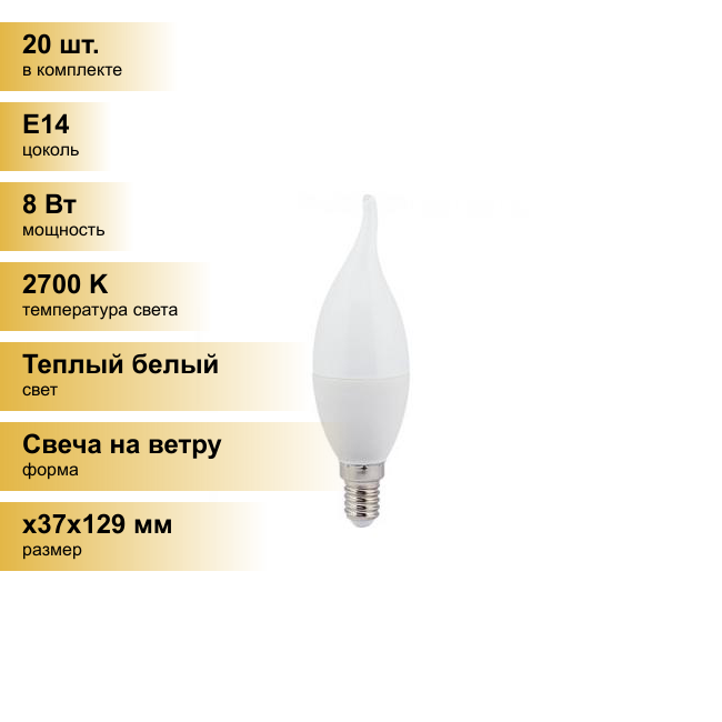 (20 шт.) Светодиодная лампочка Ecola свеча на ветру E14 8W 2700K 2K 129x37 C4YW80ELC Теплый белый. Цоколь E14 информация: