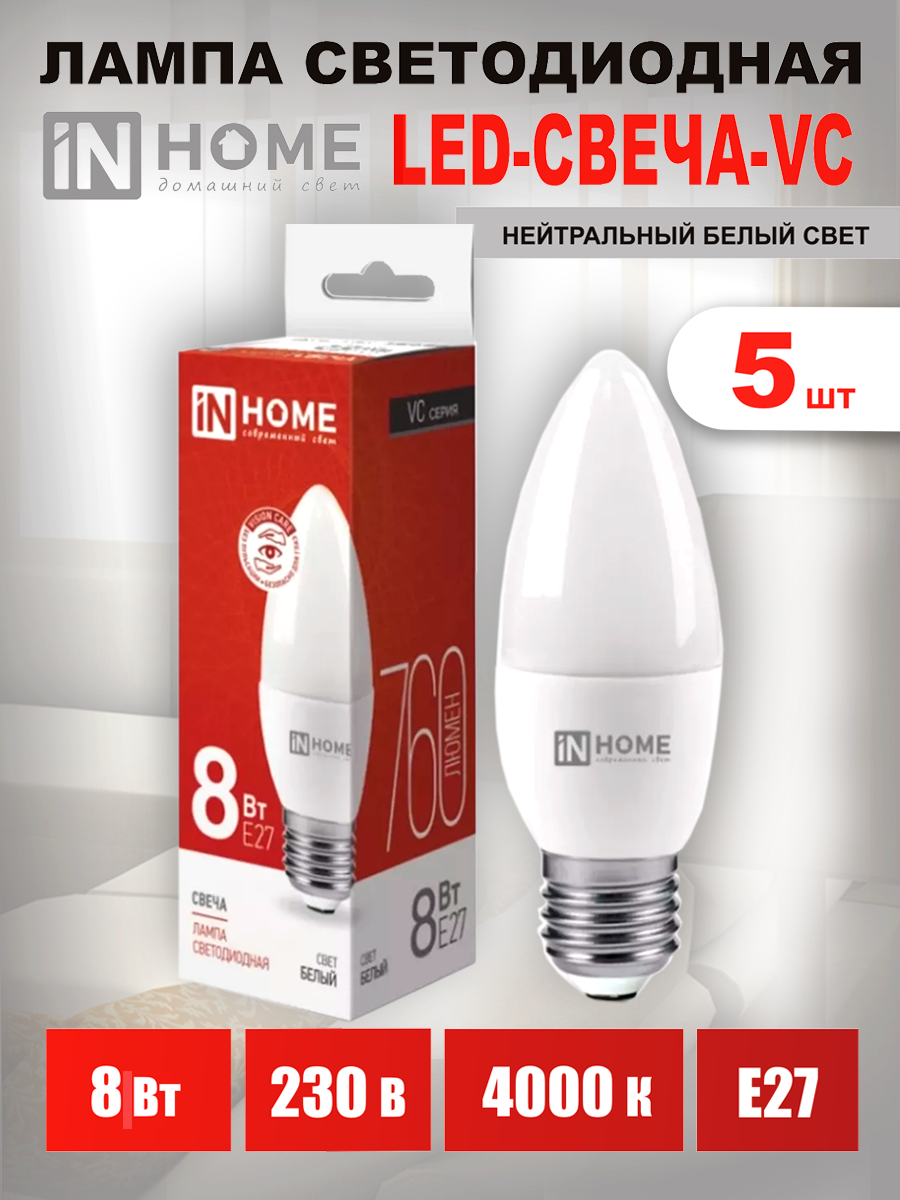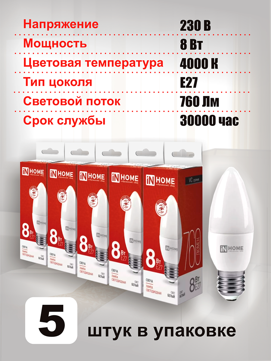 Лампа светодиодная IN HOME LED 8Вт 230В Е27 4000К 760Лм, свеча, нейтральный белый, 5 шт 528 ₽