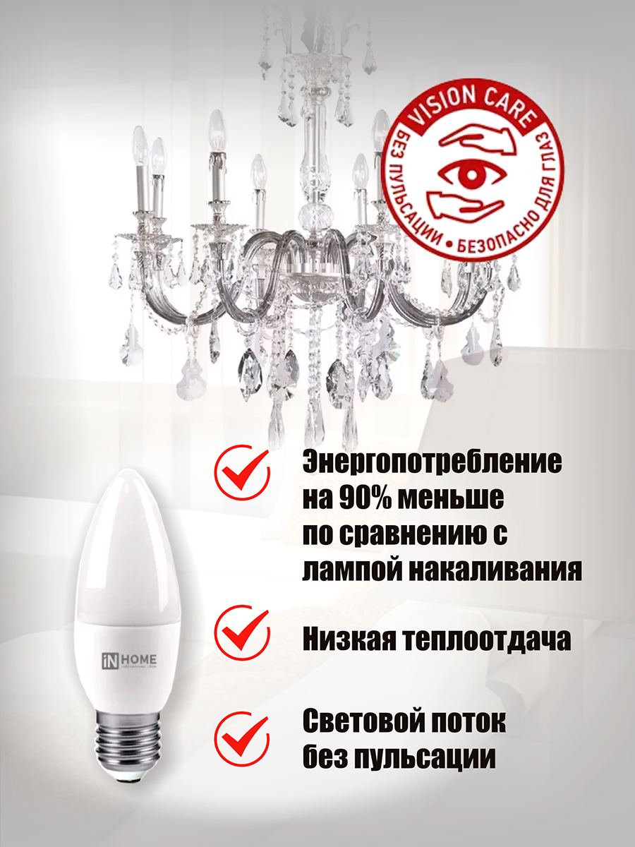 (10 шт.) Светодиодная лампочка IN HOME С37 8Вт 230В 6500К Е27 898 ₽