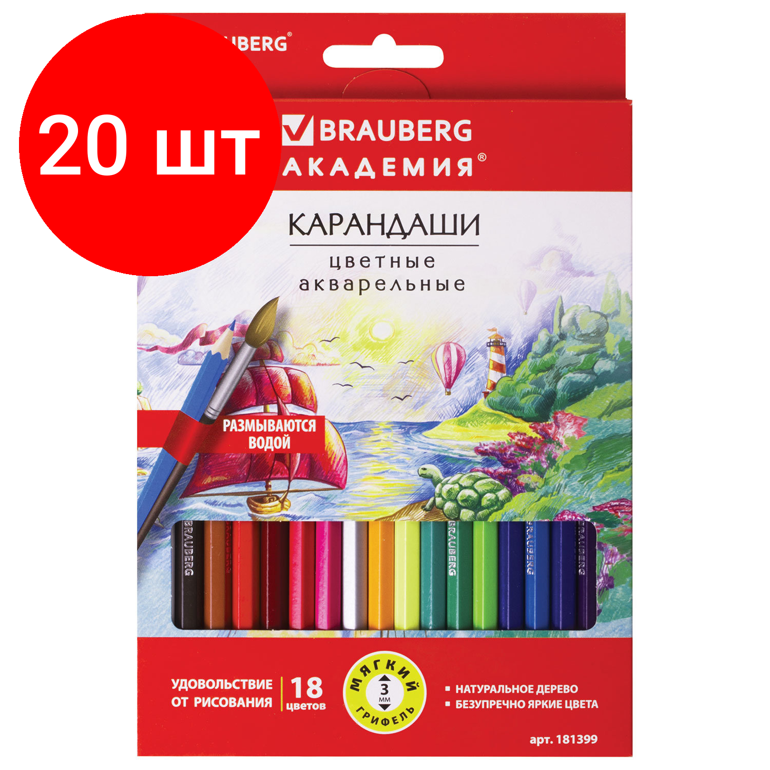 Комплект 20 шт, Карандаши цветные акварельные BRAUBERG "академия", 18 цветов, шестигранные, высокое качество, 181399 информация: