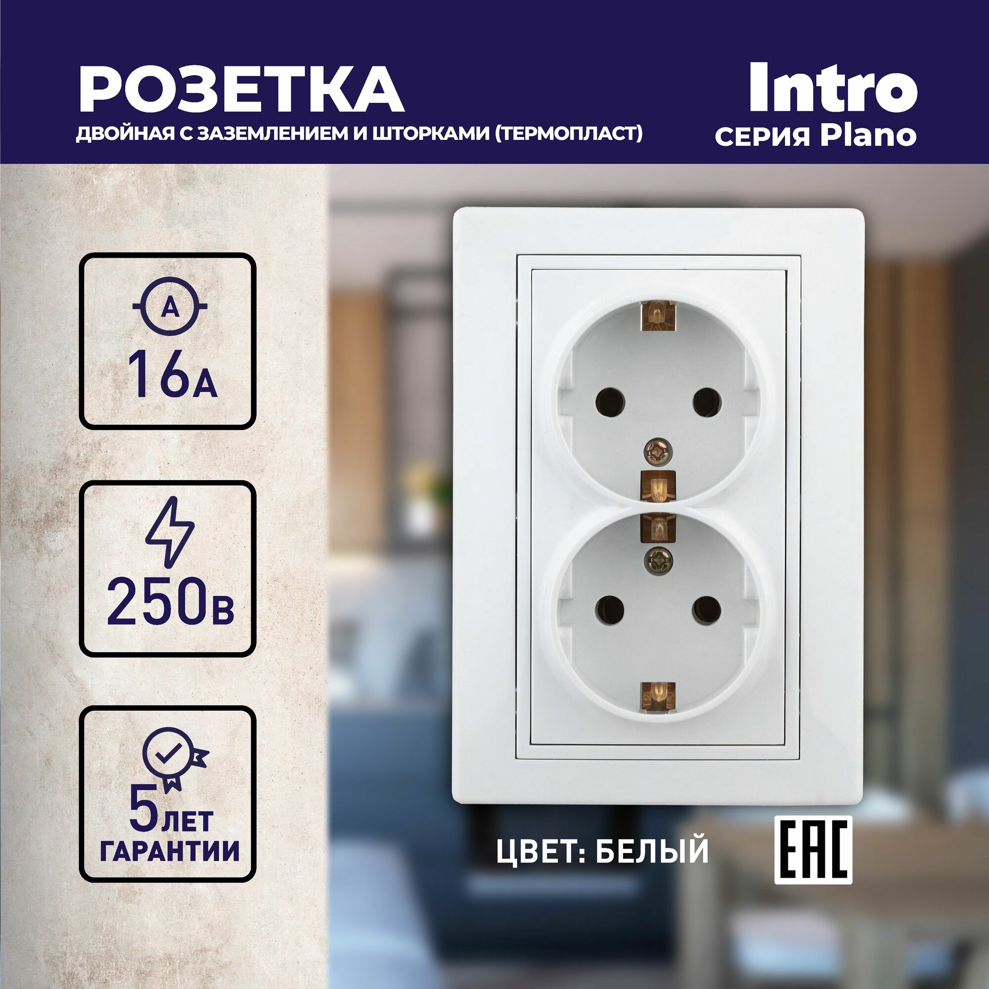 Отзывы на Розетка Intro Plano 1-208-01 с заземлением двойная 2X2P+E Schuko со шторками 16А-250В IP20 скрытой установки белая