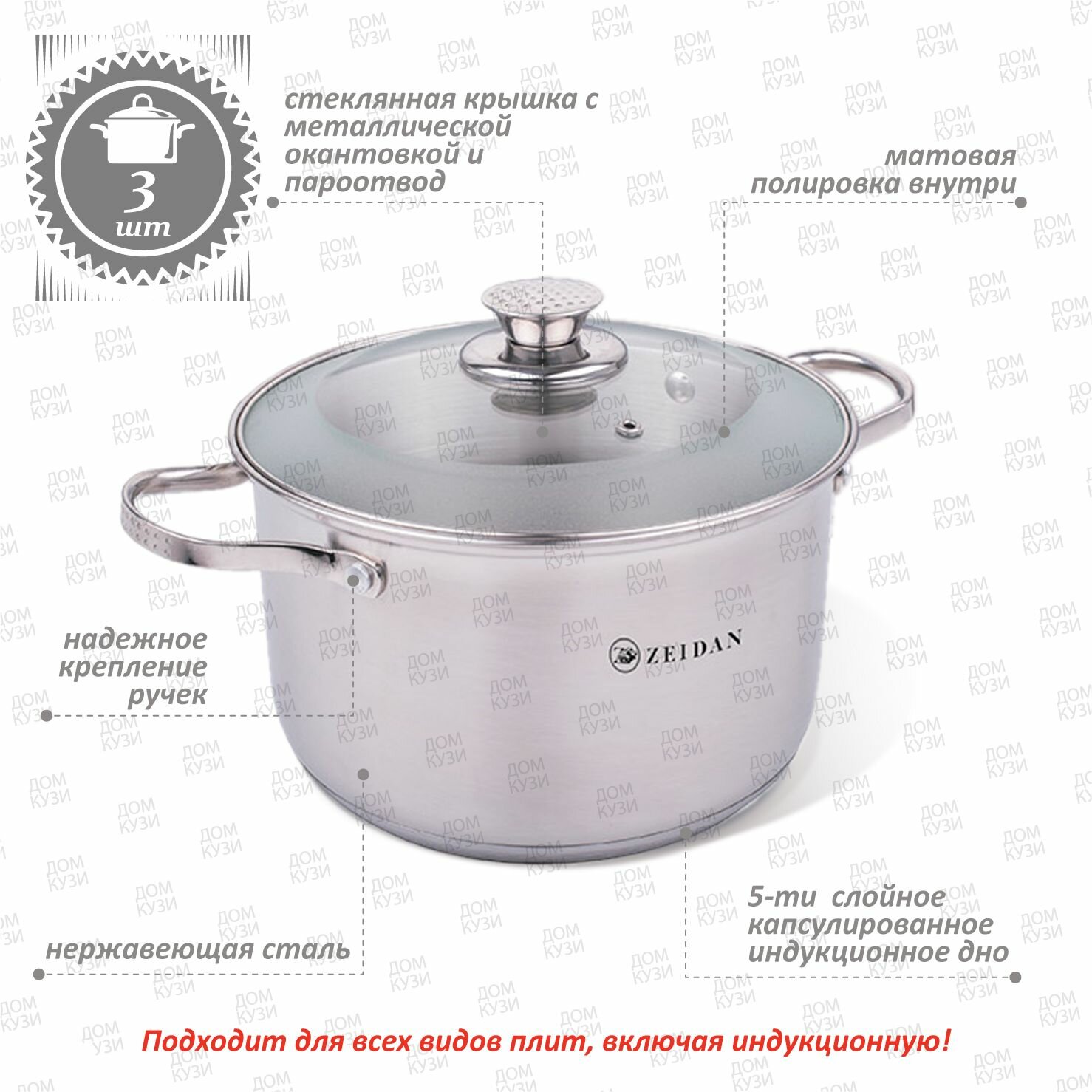 Кастрюли в наборе Zeidan из нержавеющей стали со стеклянной крышкой 2 л, 3 л и 4 л для всех видов плит информация: