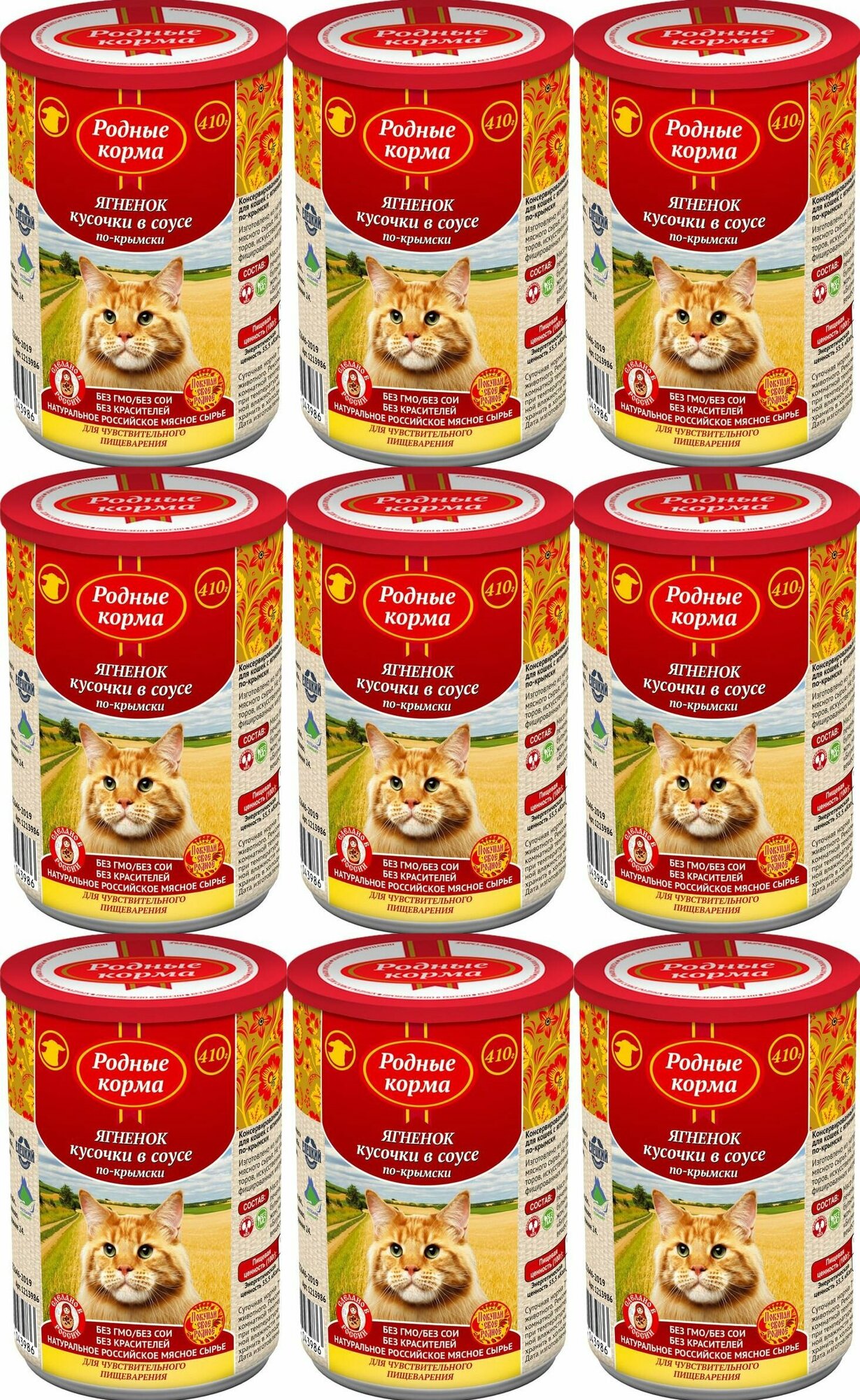 Родные Корма влажный корм для взрослых кошек Кусочки в соусе по-крымски с ягненком в консервах - 410 г х 9 шт