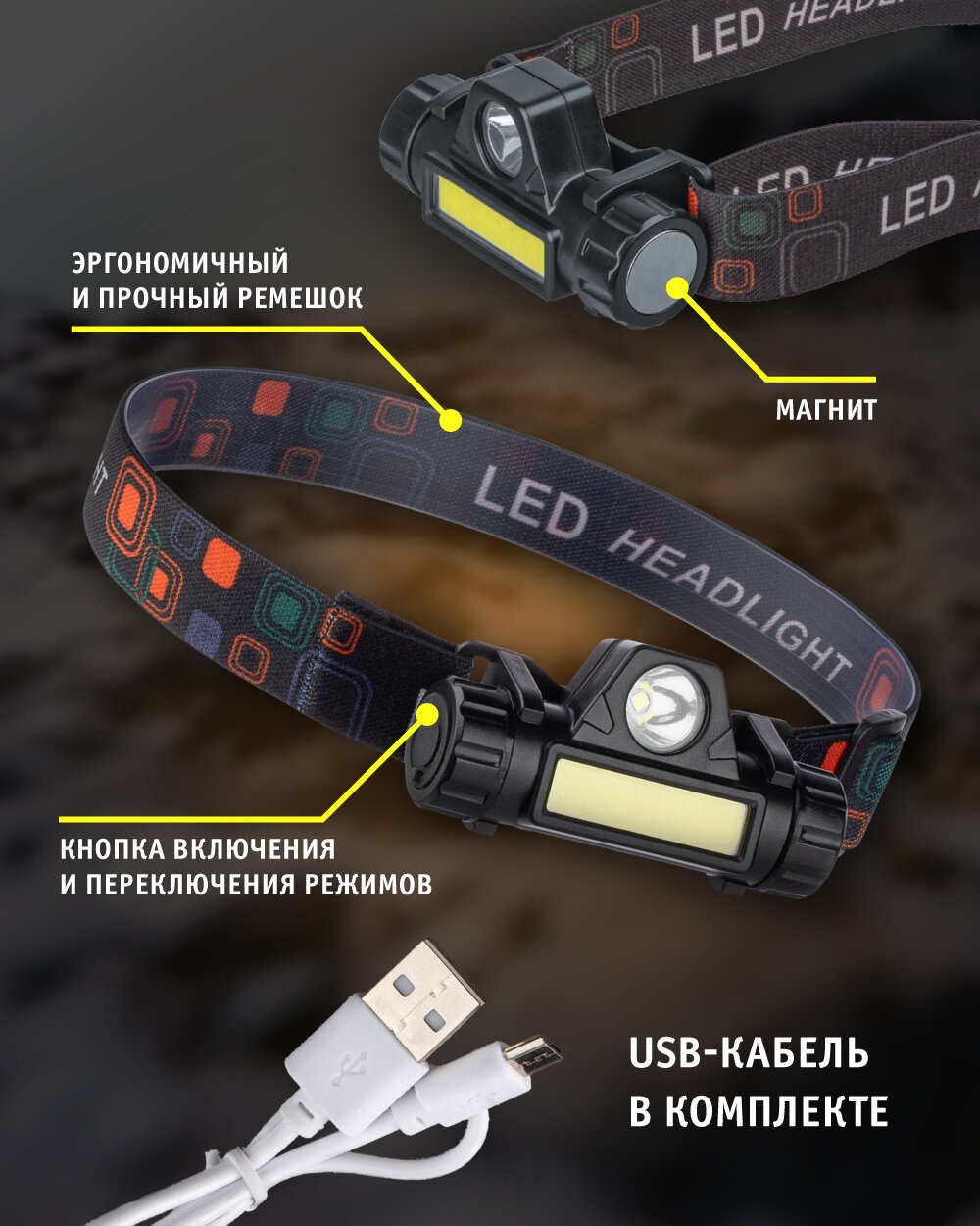 Налобный фонарь, магнитное крепление, черный, usb-зарядка, белый свет