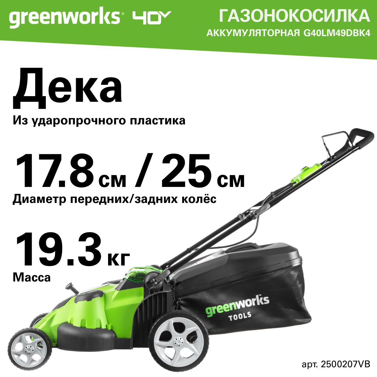 Аккумуляторная газонокосилка Greenworks 2500207vb G40LM49DBK4, 49 см