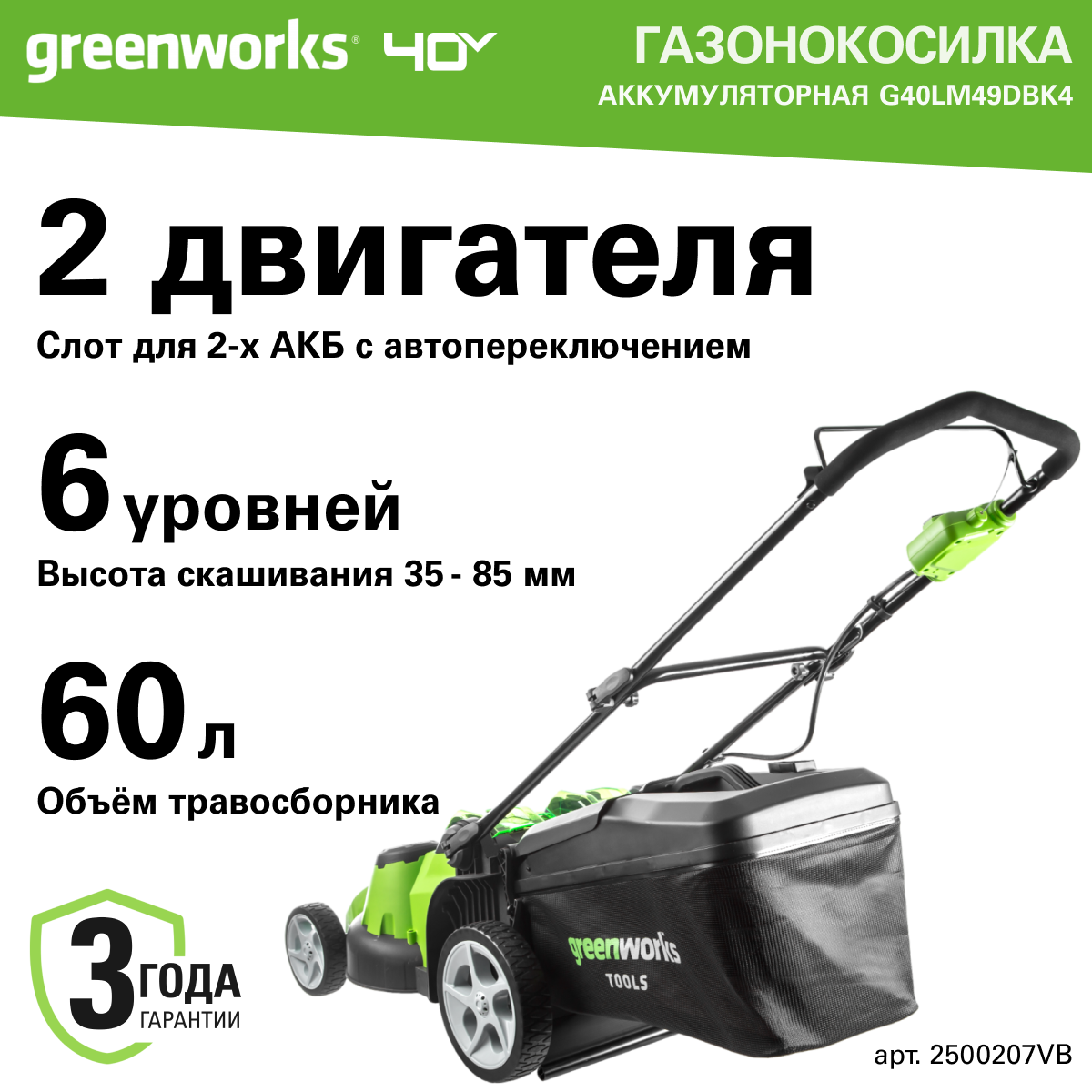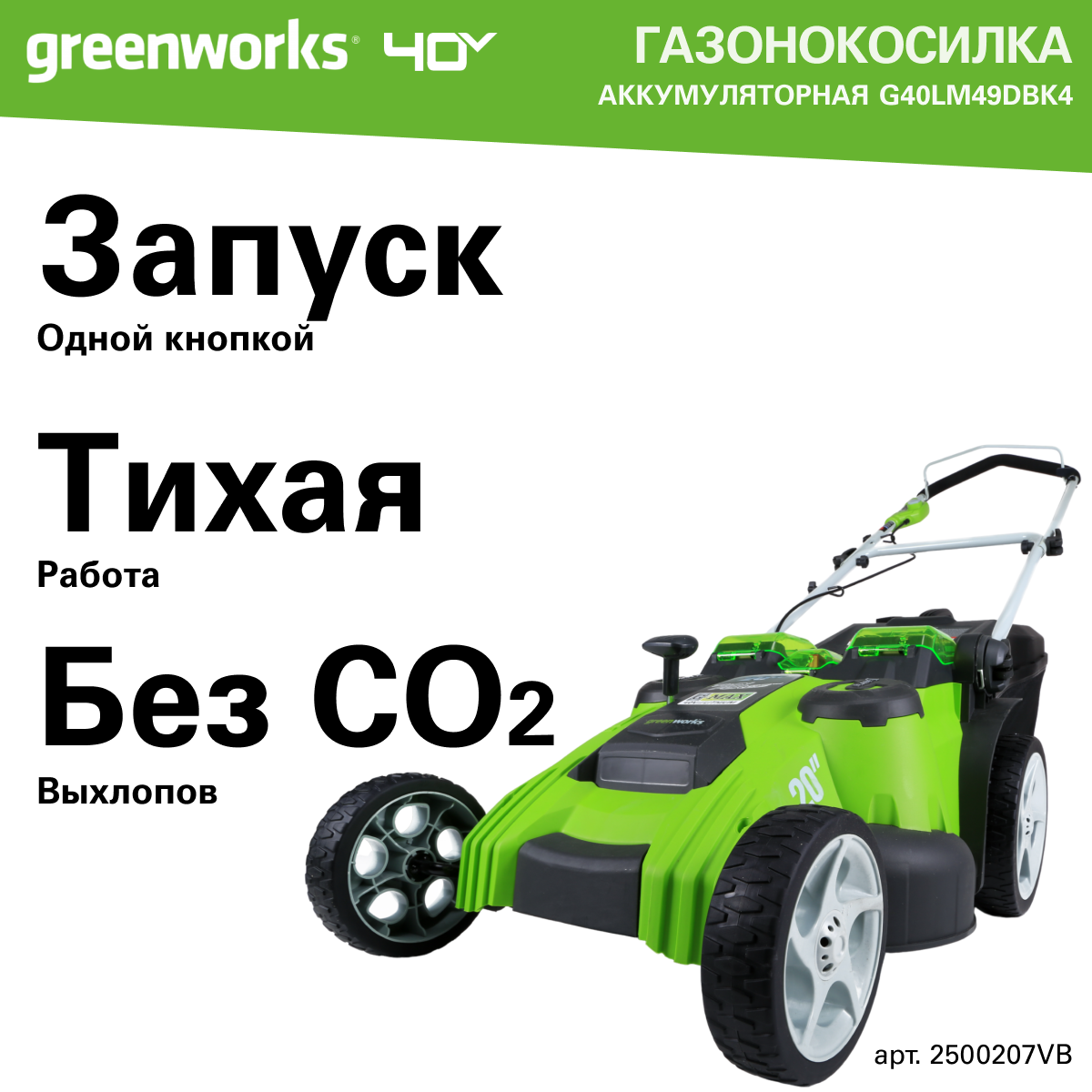 10 цен на Газонокосилка аккумуляторная Greenworks Арт. 2500207VB, TwinForce, 40V, 49 см, c 1хАКБ 4 Ач и ЗУ