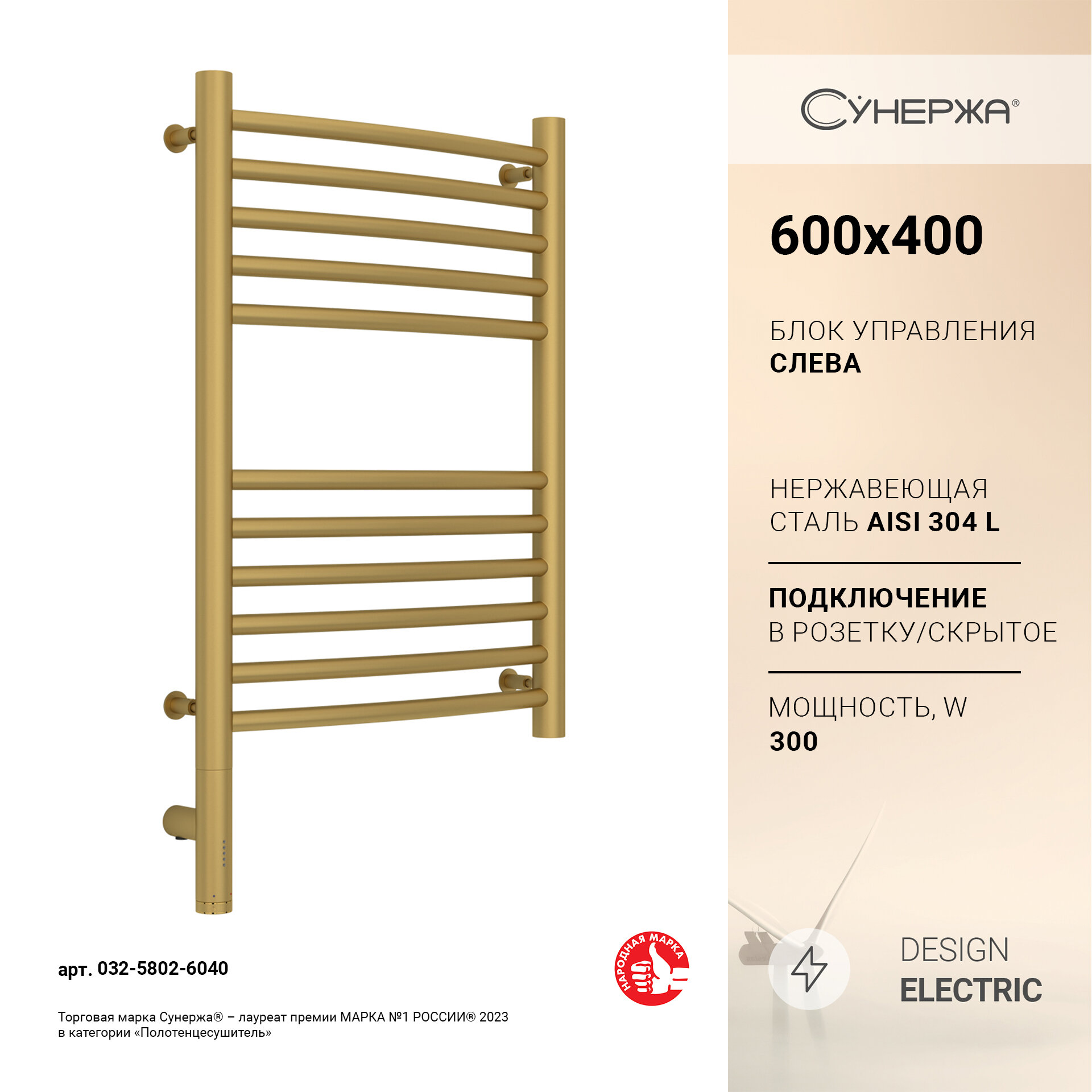 Полотенцесушитель электрический Сунержа Богема 3.0 выгнутая 600х400 МЭМ левый Матовое золото информация: