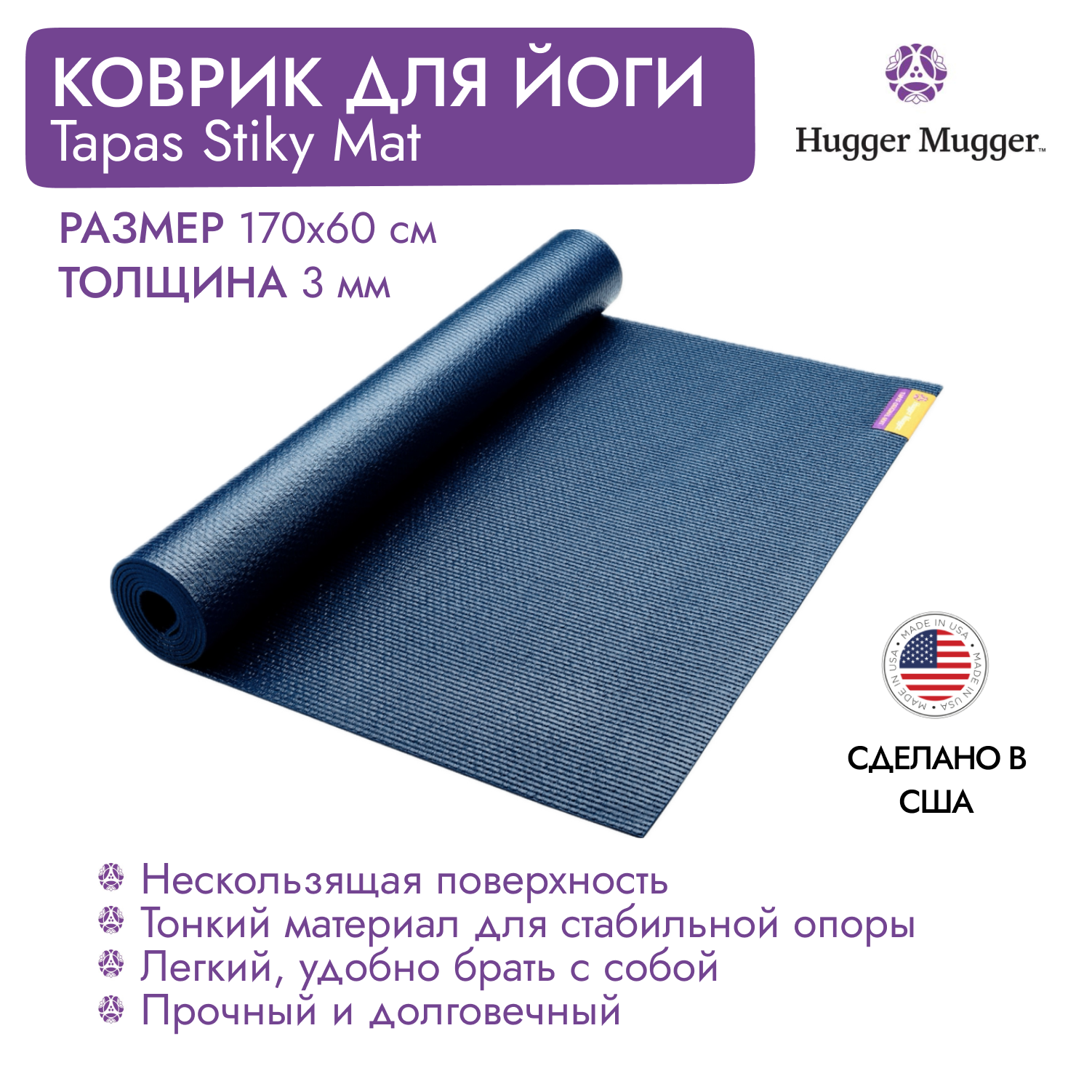 Коврик для йоги HUGGER MUGGER Tapas Sticky Mat, 170х60х0,3 см., цвет синий информация: