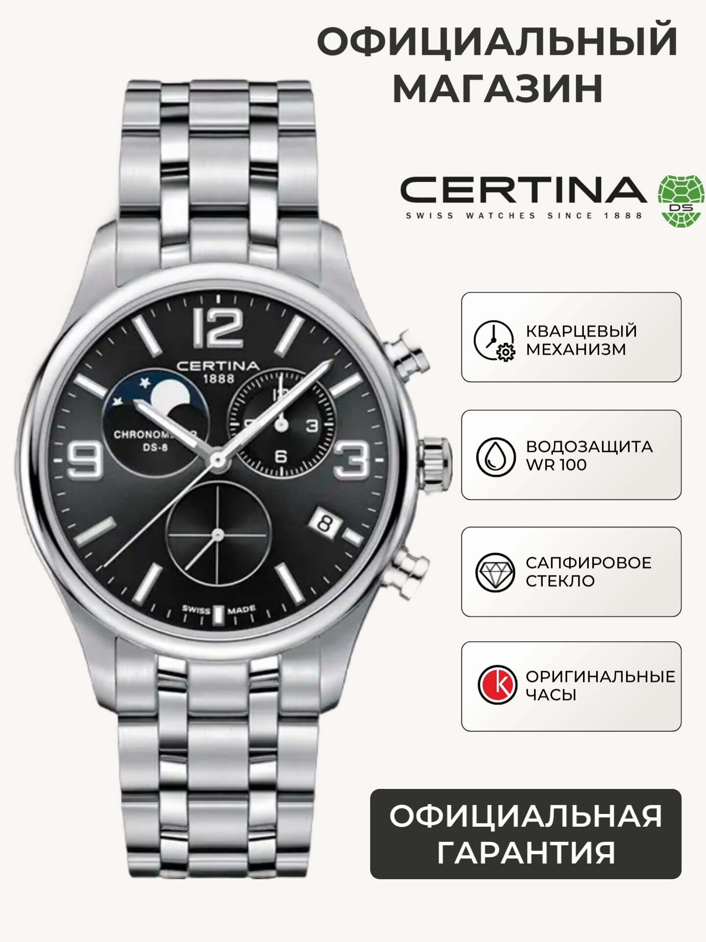 Швейцарские кварцевые часы Certina DS-8 Moon Phase C033.460.11.057.00 на стальном браслете, с водозащитой 10 бар и международной гарантией от производителя