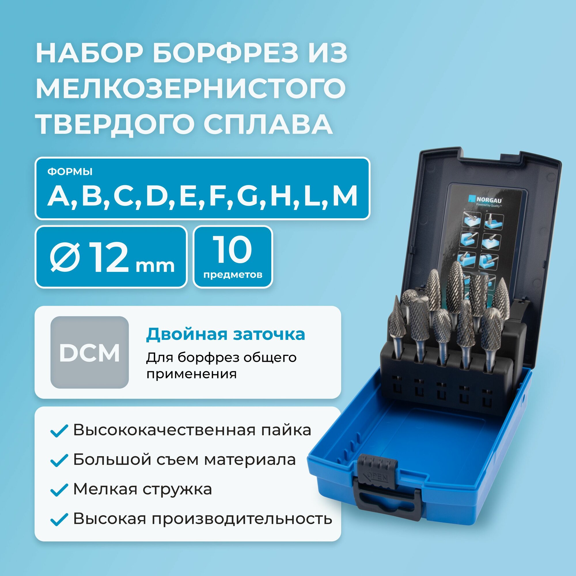077200012 Norgau Набор борфрез твердосплавных HM KPLM06X-45 Dcm, режущие головки D12мм, 10 предметов .