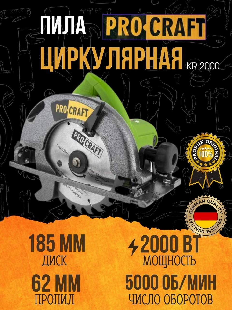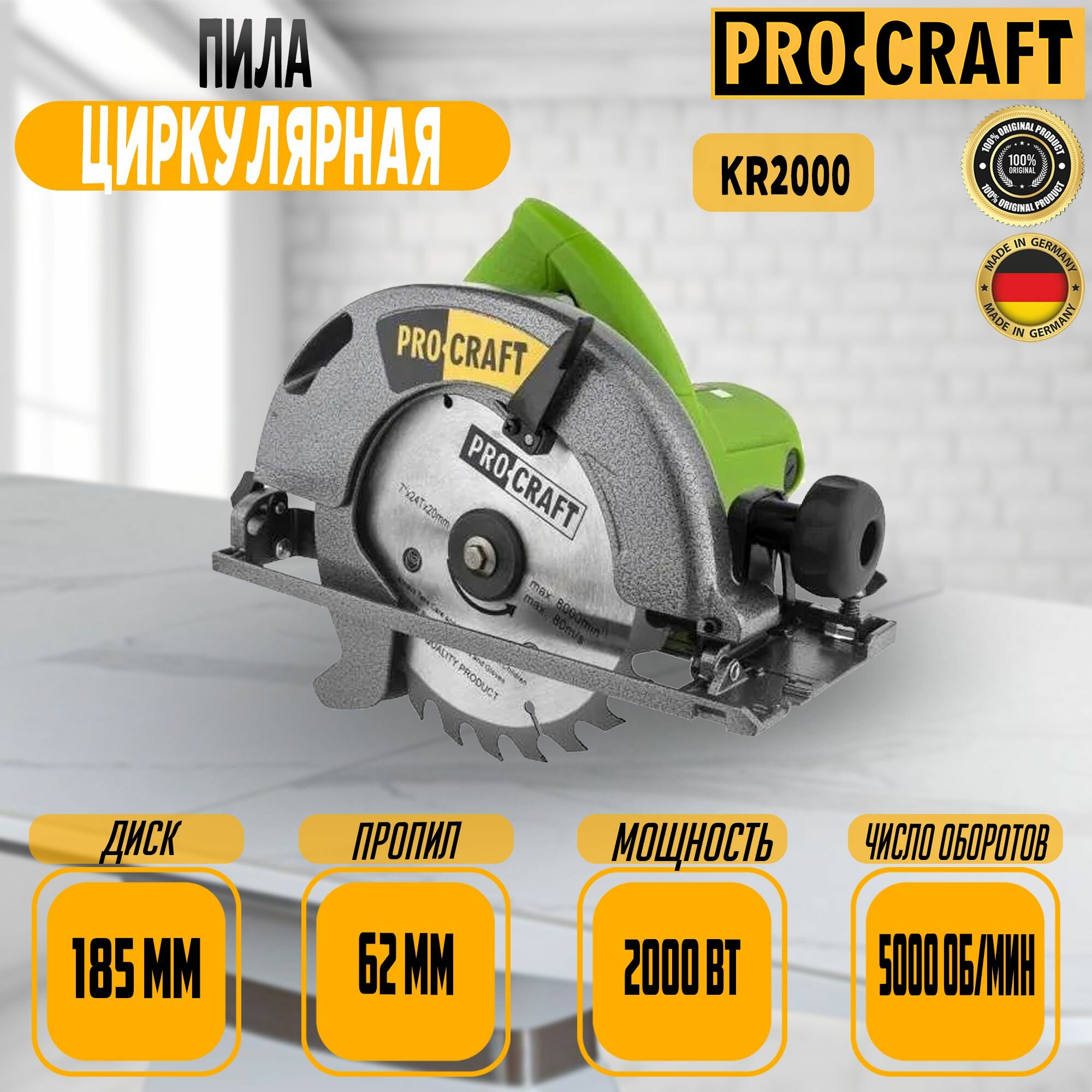 Пила дисковая циркулярная ProCraft KR2000, 2 кВт, диск Ø185 мм, пропил до 62 мм