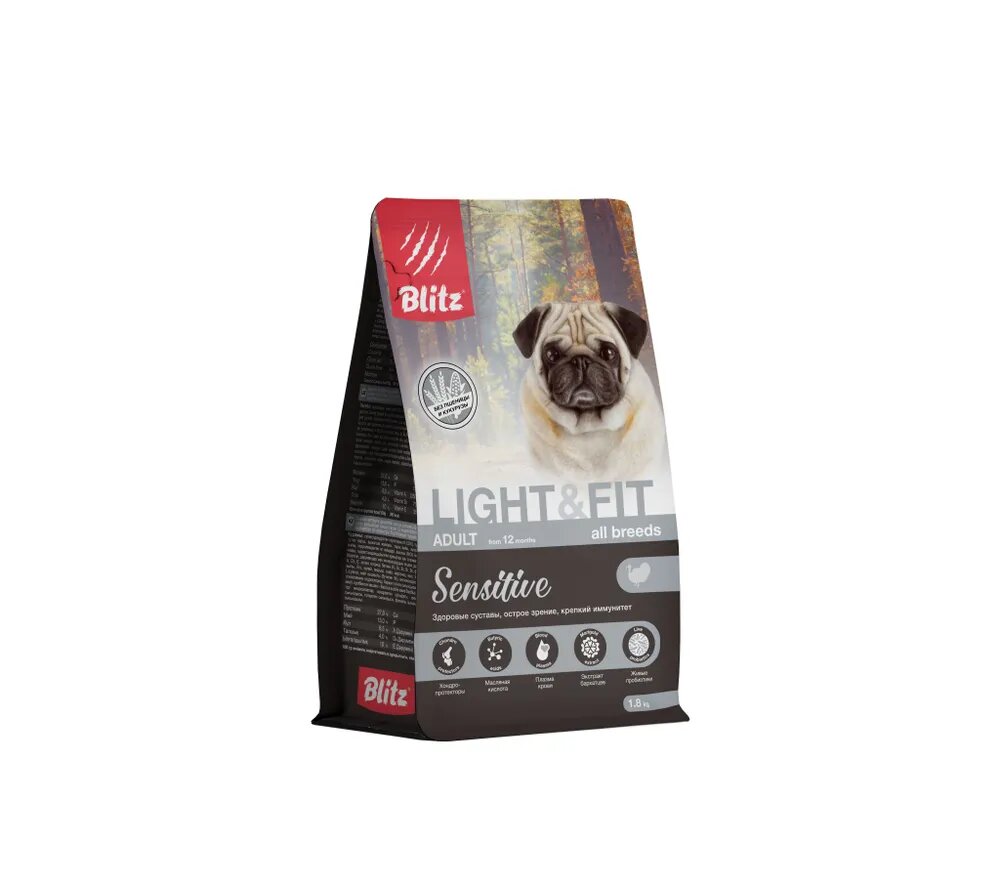 Cухой корм для взрослых собак с лишним весом BLITZ Sensitive ADULT LIGHT & FIT индейка, 1,8 кг