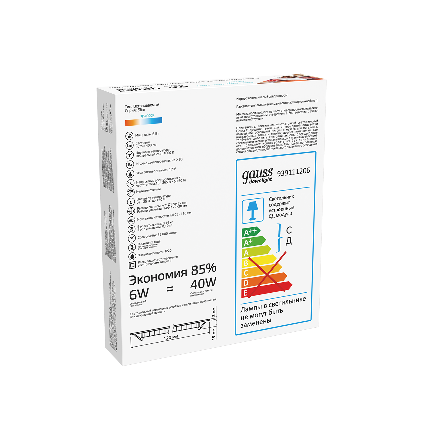Светильник встраиваемый ультратонкий 6W IP20 6W 120х22 4000K круглый Gauss информация: