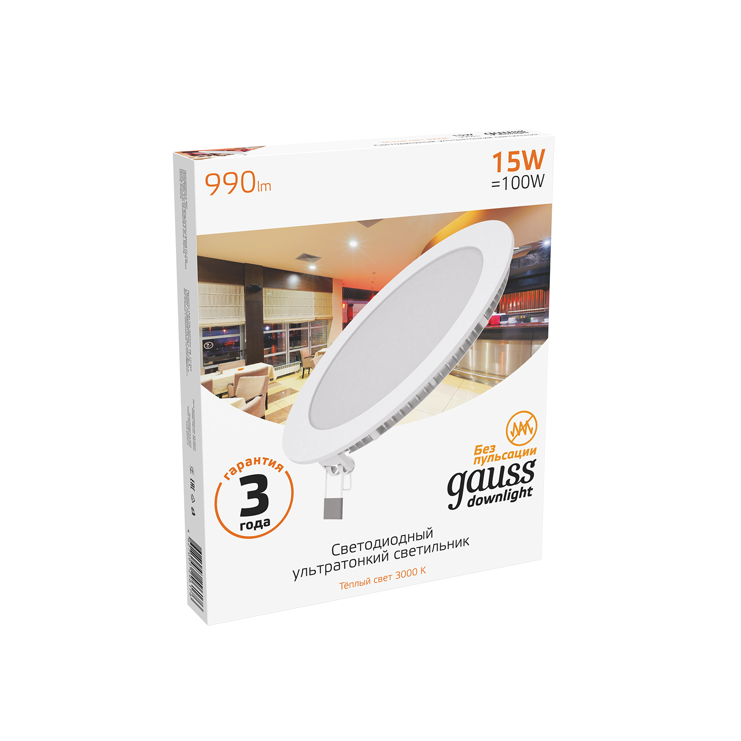 Светильник встраиваемый ультратонкий 15W IP20 170х22 3000K круглый Gauss информация: