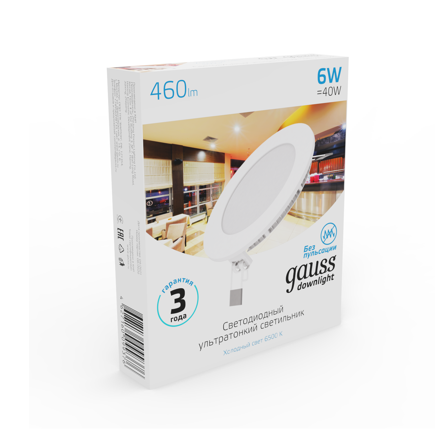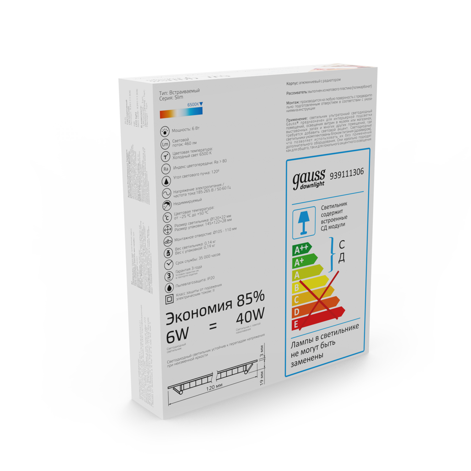 Светильник встраиваемый ультратонкий 6W IP20 120х22 6500K круглый Gauss информация: