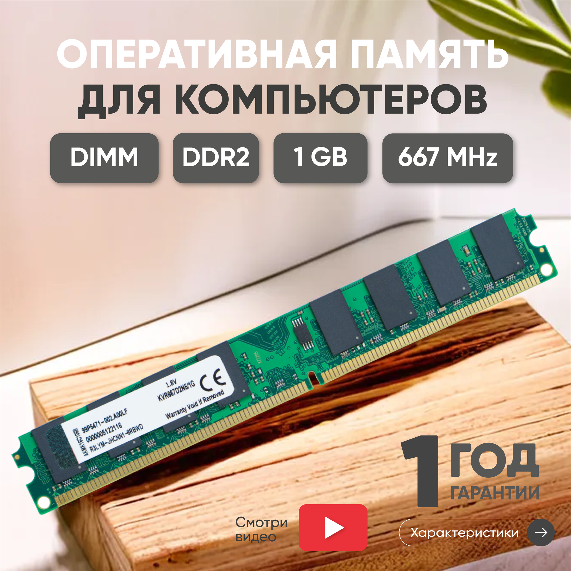 Модуль памяти Kingston DIMM DDR2, 1ГБ, 667МГц, PC2-5300, CL5 5-5-5-15 информация: