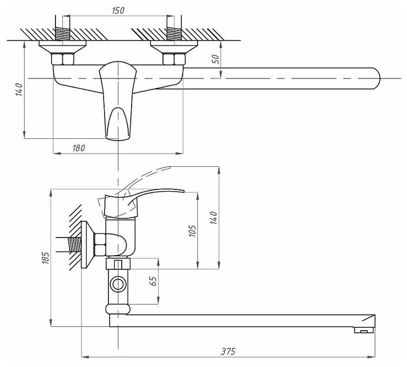 Смеситель на раковину настенный Эверест B46-350 с круглым поворотным изливом, кран-буксы 1/2", хром