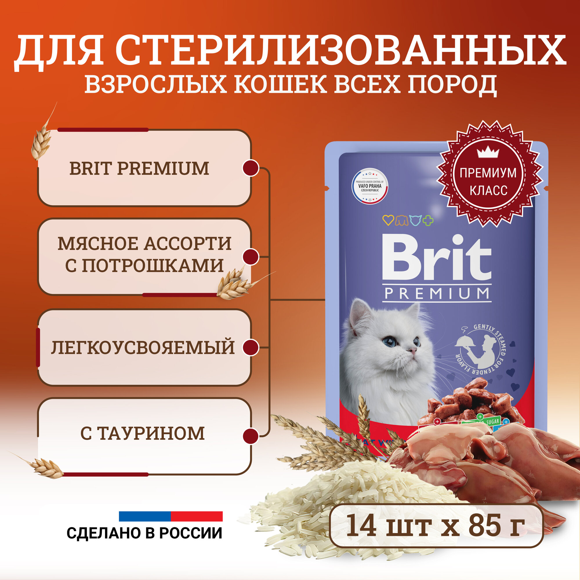 BRIT PREMIUM Паучи для взрослых стерилизованных кошек Мясное ассорти с потрошками в желе, 14 шт.*85г информация: