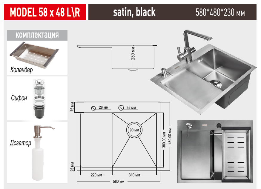 Кухонная мойка AVINA 5848 satin R, из нержавеющей стали, толщина 3мм*1,5 мм. Дозатор, коландер, сифон в комплекте. Глубина мойки 220 мм.