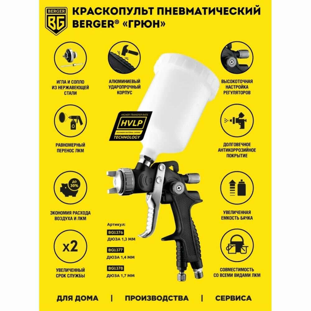 Краскопульт пневматический BERGER "грюн" HVLP 1.7 мм BG1378 информация: