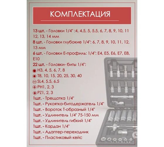 | Головки торцевые подробно | 1/4": 4, 4.5, 5, 5.5, 6, 7, 8, 9, 10, 11, 12, 13, 14 мм; длинные 1/4": 3, 4, 5, 6, 7, 8, 10 мм; Torx 1/4": E4, E5, E6, E7, E8, E10; с битами 1/4": T8, T10, T15, T20, T25, T27, T30, T40, SL4, SL5.5, SL6.5, PH1, PH2, PH3, PZ1, PZ2, PZ3 |