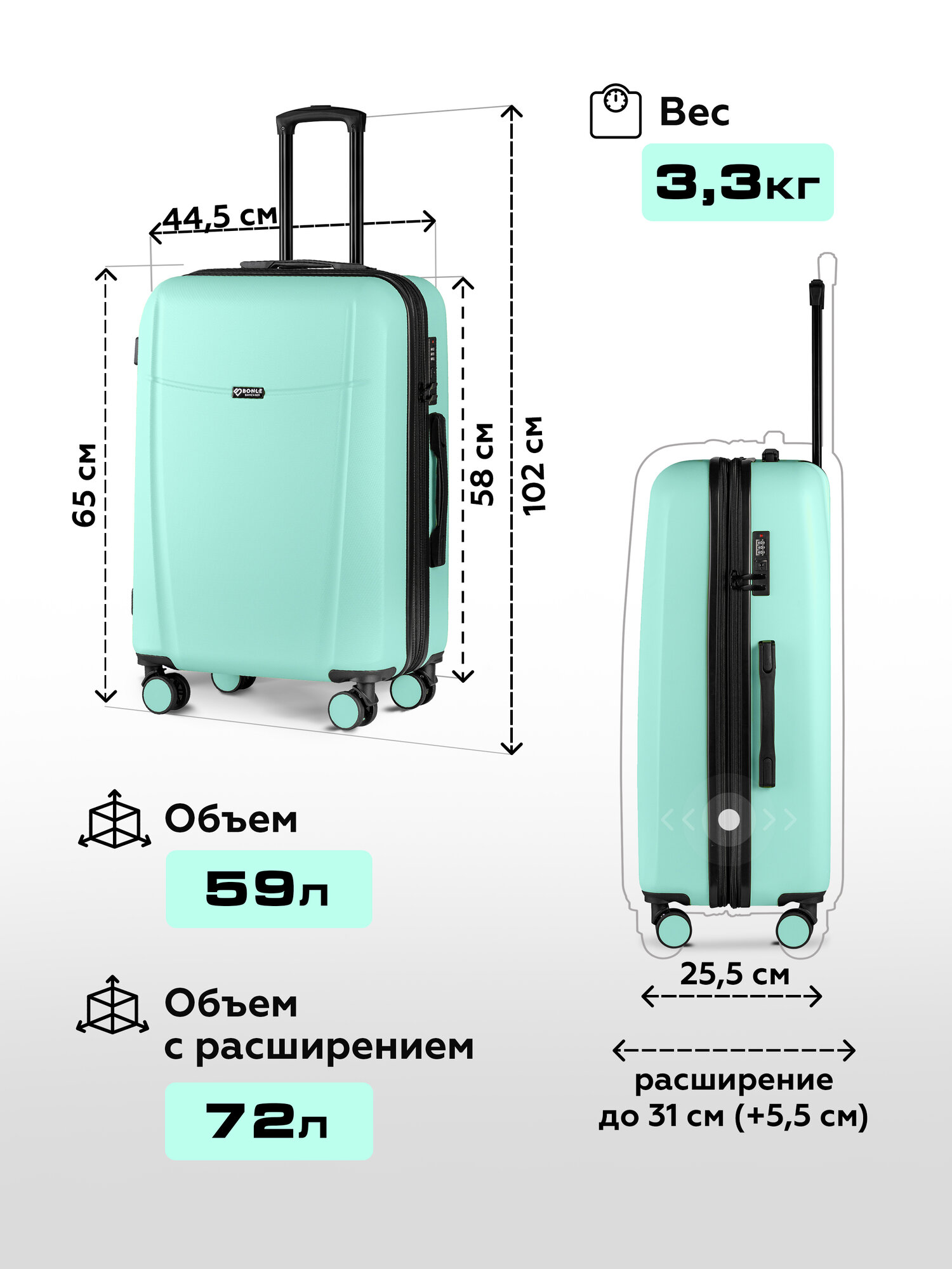 Чемодан на колесах M мятный Bonle, премиум ABS-пластик 65 см, 72 л, средний дорожный информация: