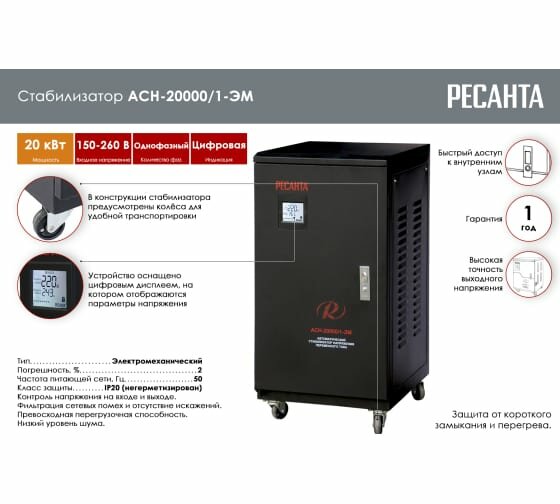 Стабилизатор АСН-20 000/1-ЭМ Ресанта (однофазный, 140 В - 260 В, 105,3 А, 20 кВт, 50 Гц, клеммы, LCD-дисплей) информация: