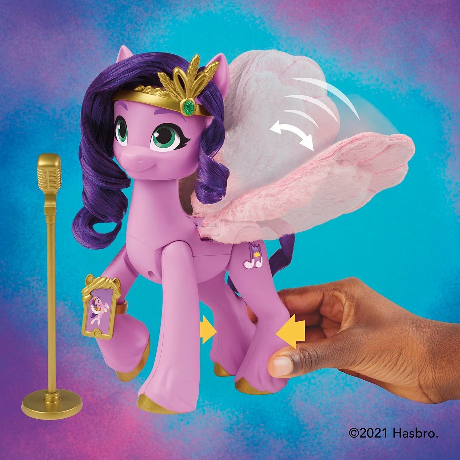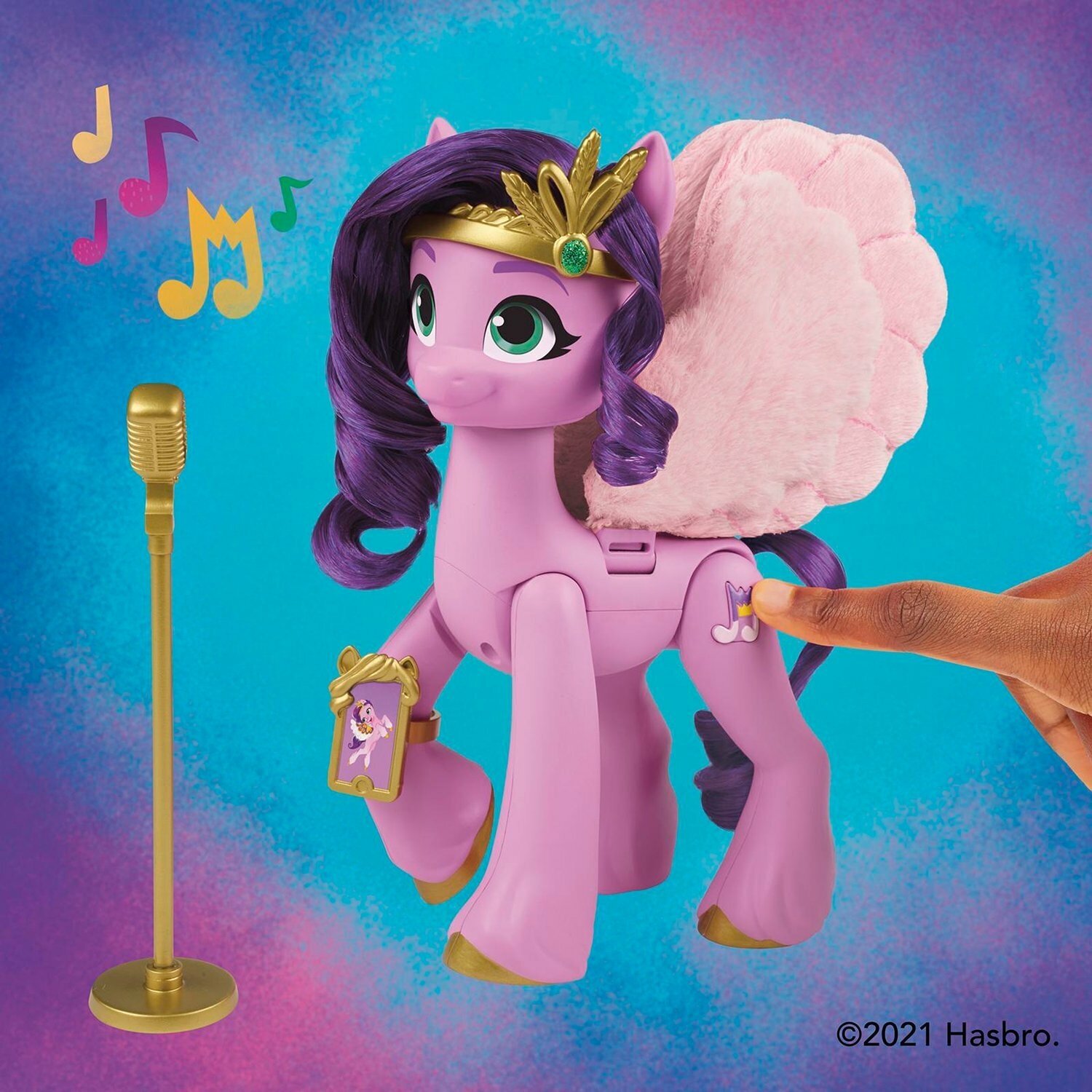 | Дополнительная информация | фигурка Принцессы Петалс имеет фиолетовые волосы и знак отличия в виде ноты, нажав на который, можно услышать песню из мультфильма «My Little Pony: Новое поколение»; чтобы пони взмахнула пушистыми крыльями, сожмите задние ноги фигурки вместе; песня звучит только на английском языке, для работы требуется 1 батарейка типа ААА |