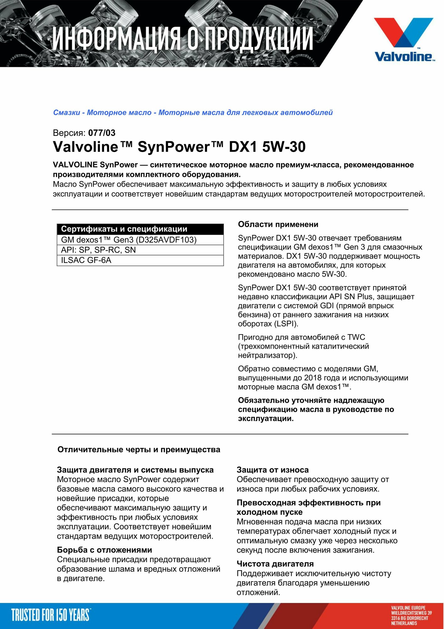 Синтетическое моторное масло SynPower DX1 5W30 информация: