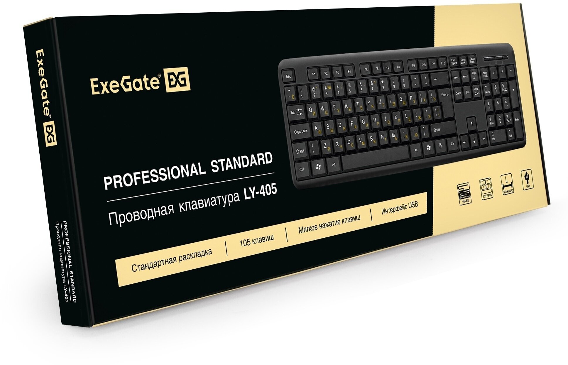 Клавиатура ExeGate Professional Standard LY-405 (USB, полноразмерная, влагозащищенная, 105кл., Enter большой, длина кабеля 1,5м, черная, Color Box) EX287138RUS