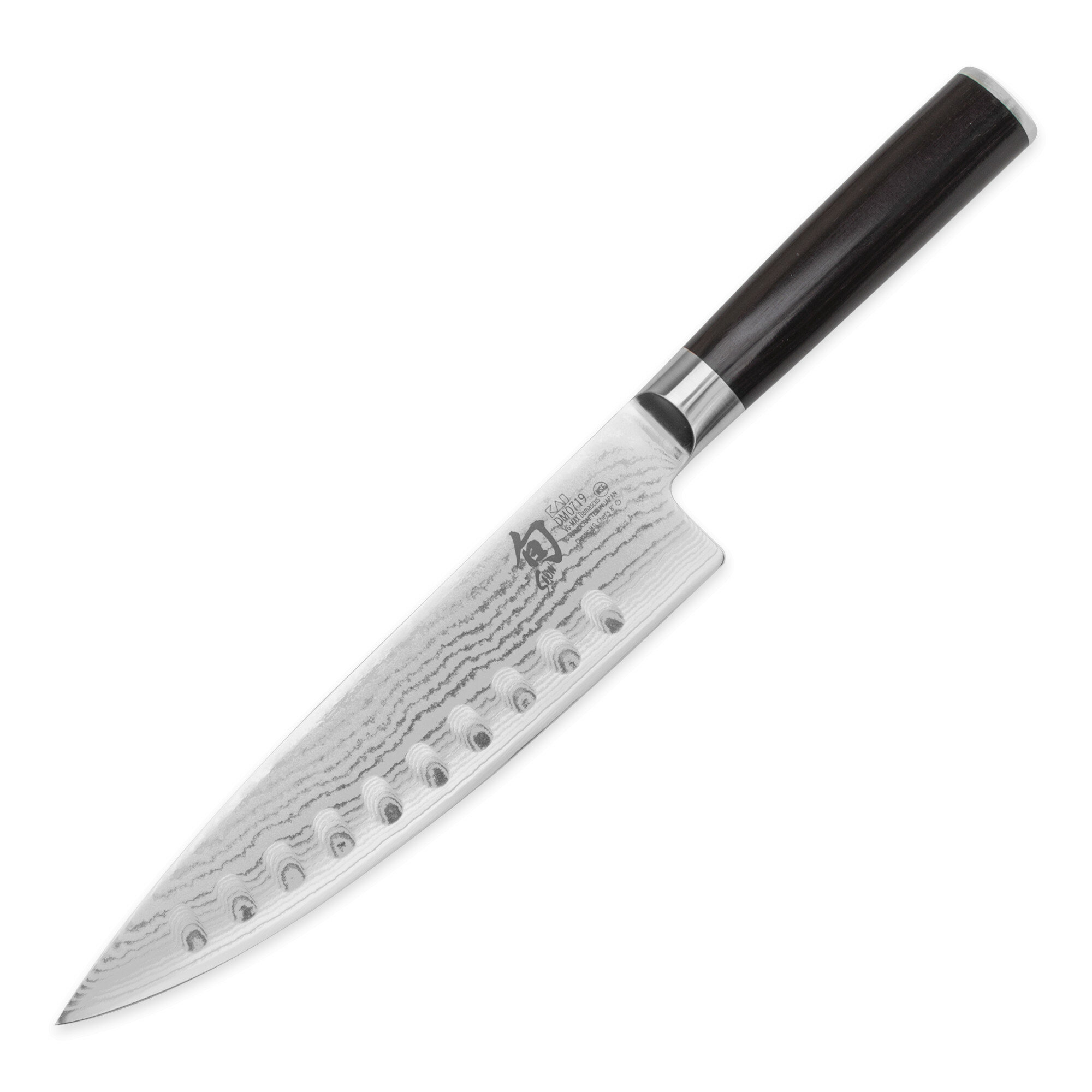 Нож кухонный поварской гюйто из дамасской стали с углублениями на лезвии, 21.6 см, рукоять из стабилизированной древесины, черный, серия Shun Classic, Kai, KAI-DM-0719