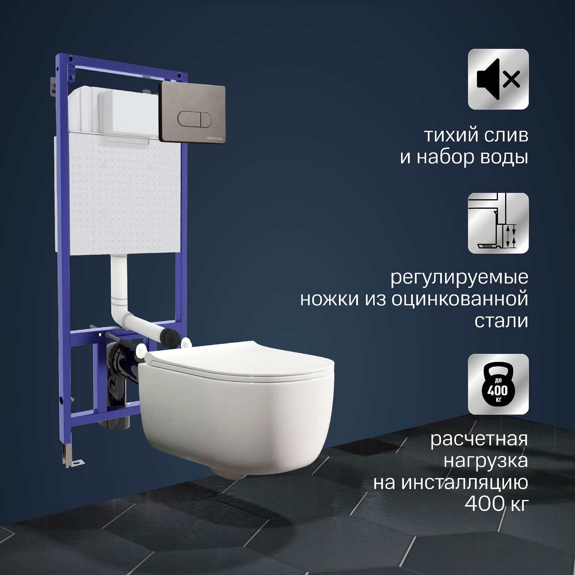 Инсталляция BERGES для скрытого монтажа унитаза NOVUM кнопка F2 матовый хром